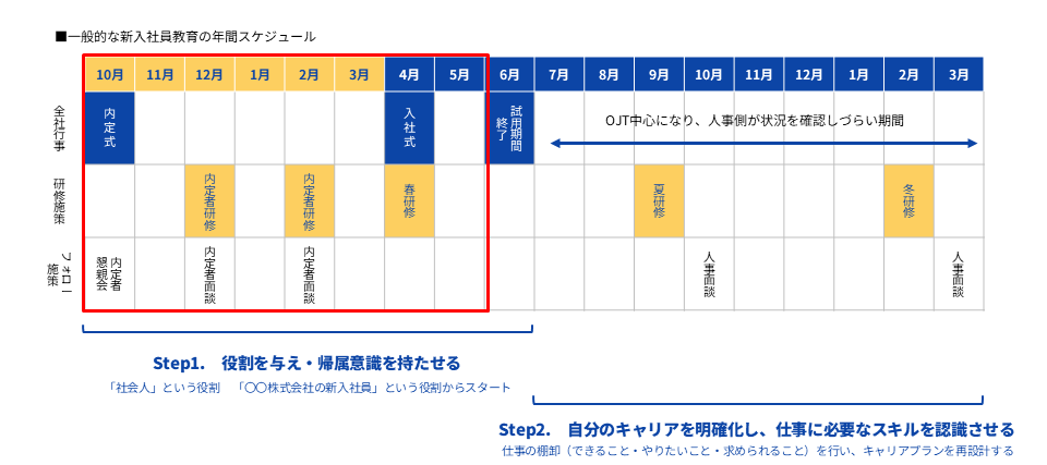 新入社員の特性を踏まえたうえで、いくつかのステップに分けて社内教育を進めていく必要があります。