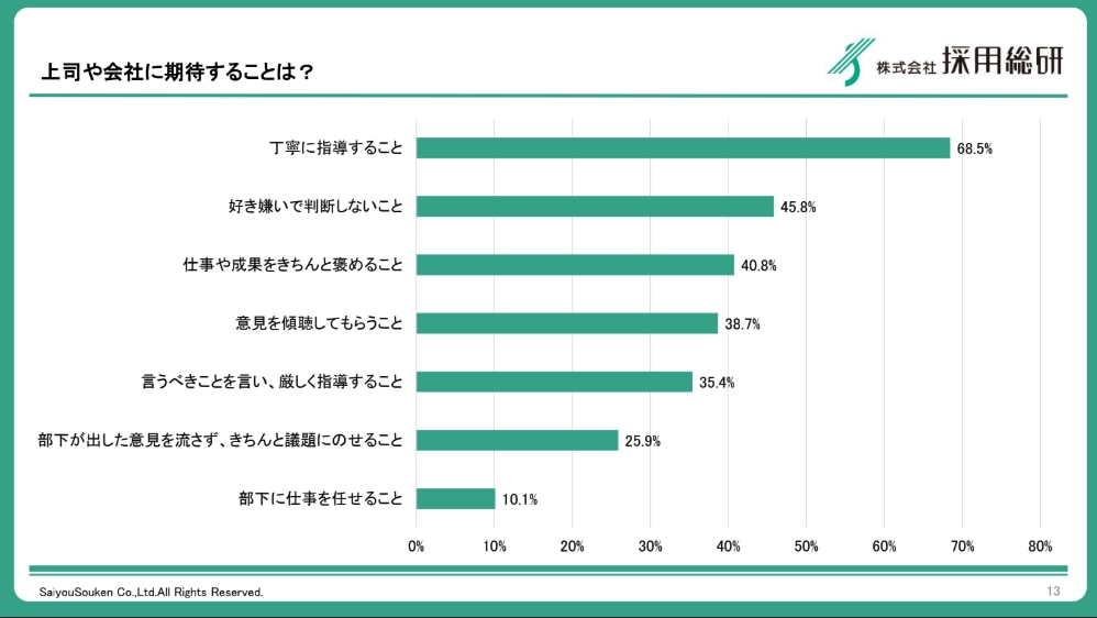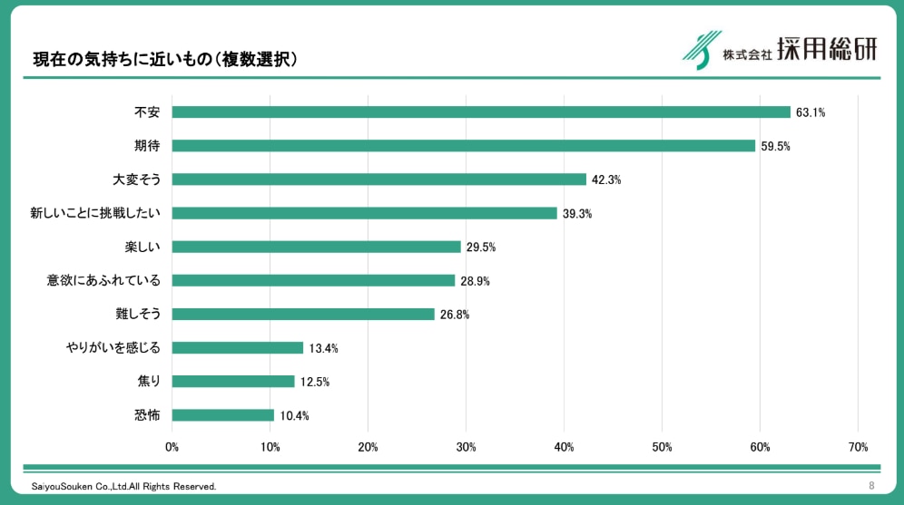 実際に、弊社が2025年4月に実施した意識調査では、現在の気持ちとして「不安(63.1%)」が「期待(59.5%)」を上回るという結果が出ています。また、上司に期待することとして「丁寧に指導すること(68.5%)」が圧倒的1位となっており、手厚いサポートを求める「お客様意識」の裏側には、失敗したくないという強い不安が隠れていることが分かります。
