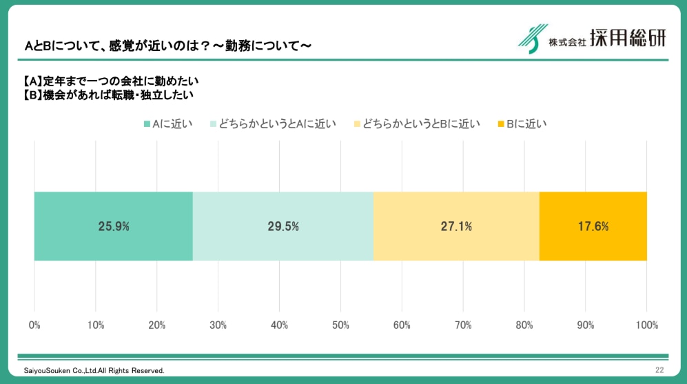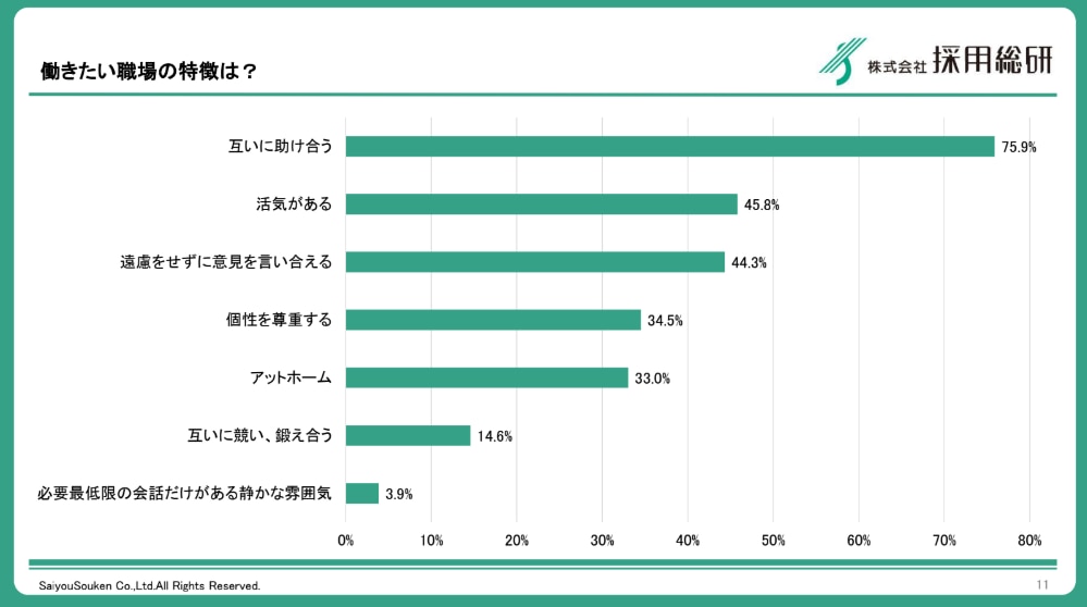 意外なことに、今の若手は「すぐ辞める」と思われがちですが、実際には55.4%が「定年まで一つの会社に勤めたい」という志向を持っています。それにもかかわらず離職が絶えないのは、彼らが理想とする「互いに助け合える職場(75.9%)」とのギャップに直面し、不安を解消できないまま「ここではない」と判断してしまうからです。