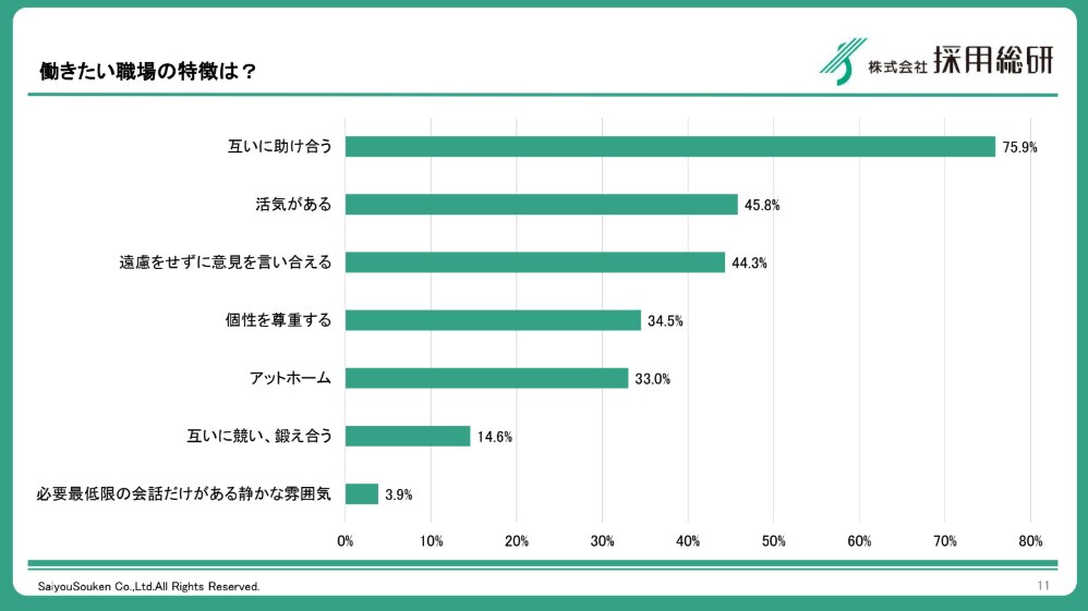 今の新入社員が働きたい職場の特徴として、圧倒的1位なのが**「互いに助け合う(75.9%)」**環境です。社内だけでは「馴れ合い」になりがちなこの特性も、他社合同の場であれば「共に高め合い、助け合う同期」というポジティブな関係性として機能します。他社の仲間と出会い、切磋琢磨することは、彼らが最も望む「安心感のある成長環境」そのものなのです。