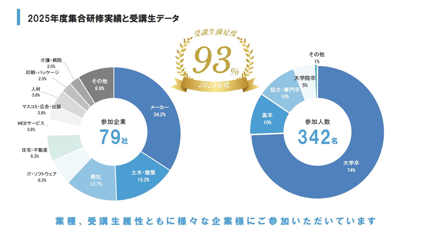 採用総研が主催する集合研修は、業種や属性の枠を超えた多様な学びの場となっています。2025年度の実績では、以下の通り非常に高い支持を得ています。