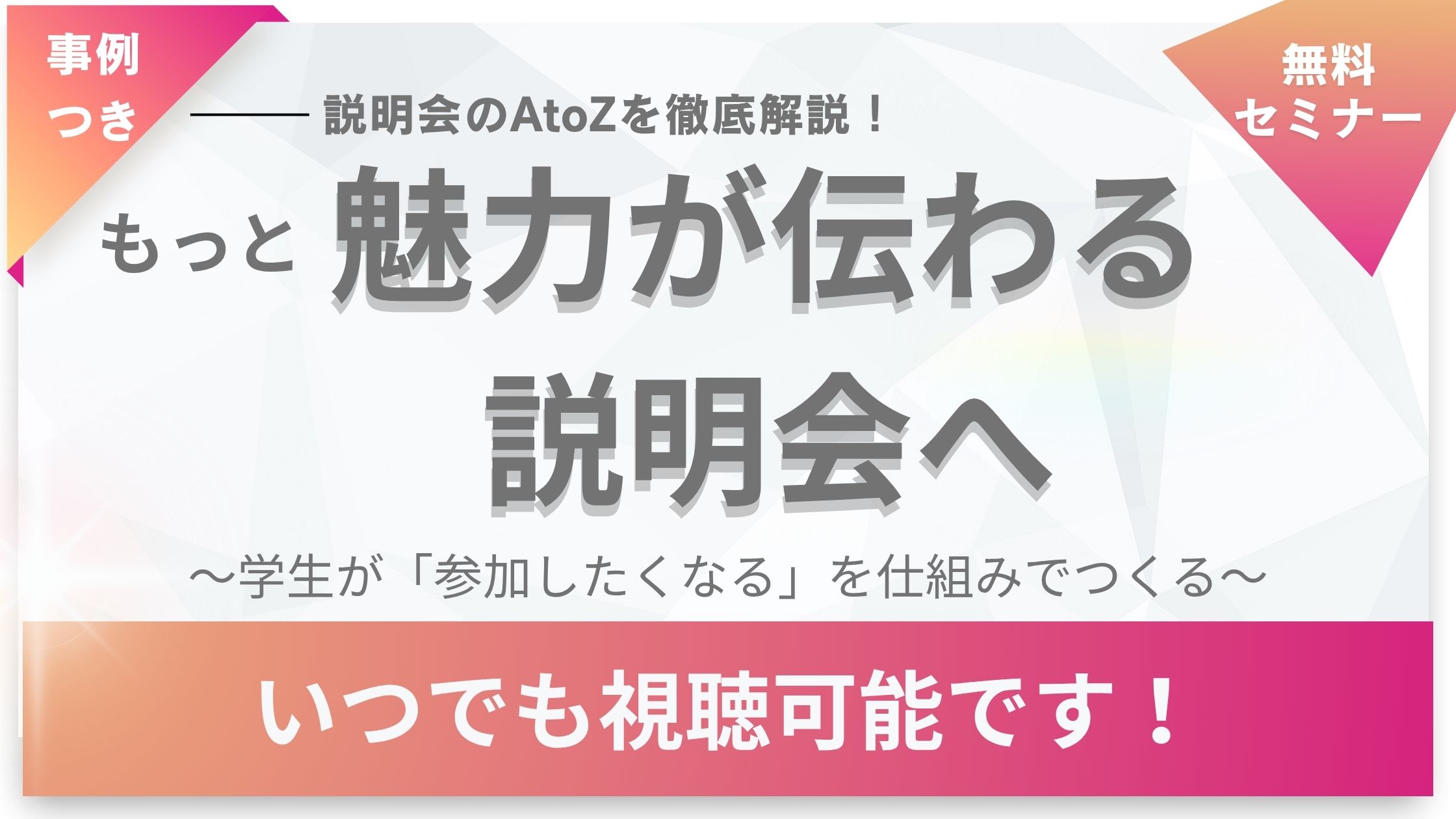 ・自社の説明会が、学生から見て満足する内容になっているかが分からない...。 ・学生が「参加してよかった!」と思える説明会を実現したい! ・コンテンツを刷新したいけど、何から手を付ければいいかわからない。 ・日程を上げているのに、予約が埋まらない...。 ・説明会の予約率をもっと上げたい!