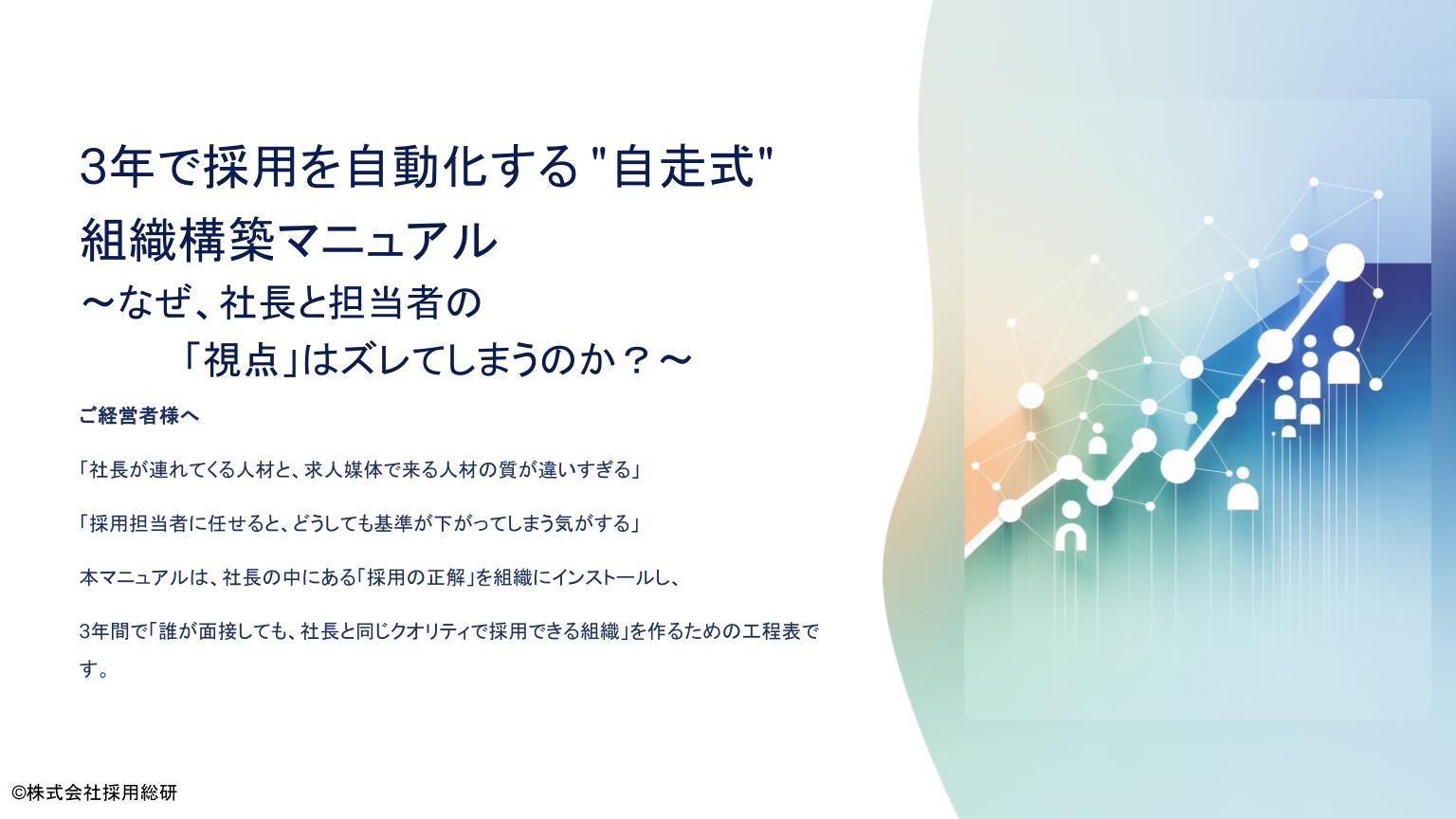 もし明日、あなたが社長を退任するとしたら、後継者は「あなたと同じ基準」で優秀な人材を見抜けるでしょうか? 本レポートは、社長の頭の中にある「採用基準」を組織にインストールし、3年間で自走する採用チームを作るためのマニュアルです。属人的な「勘」を「形式知」に変え、再現性のある組織を作るための具体的なロードマップと、実際の導入成果(成功事例)を公開します。